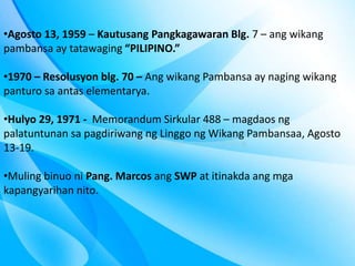 Ang mga sumusunod ay ilam lamang sa mga naging mahahalagang pangyayari sa wika sa Pilipinas Noong 1935 nagtatag ng tinatawag na wikang Pambansa Noong 1936 itinatag ang Surian ng Wikang Pambansa na may tungkuling pag aralan at paunlarin ang wikang pambansa at. Ang Kasaysayan ng Wikang Filipino Ang Pilipinas ay binubuo ng maraming isla at ng ibat ibang etnolinggwistikong grupo. Timeline 1934 Kumbensyong Konstitusyunal Ito ay binubuo ng mga delegado mula sa ibat ibang parte ng Pilipinas.