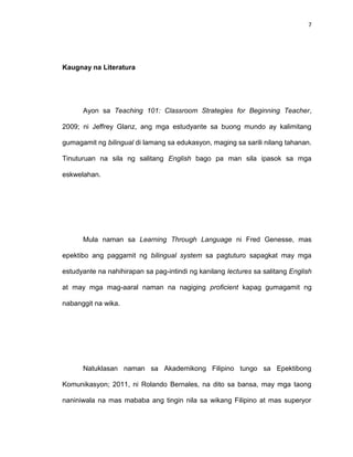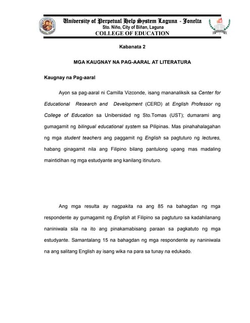 Niño City of Biñan Laguna COLLEGE OF EDUCATION Kabanata 2 MGA KAUGNAY NA PAG-AARAL AT LITERATURA Kaugnay na Pag-aaral Ayon sa pag-aaral ni Camilla Vizconde isang mananaliksik sa Center for Educational Research and Development CERD at English Professor ng College of.